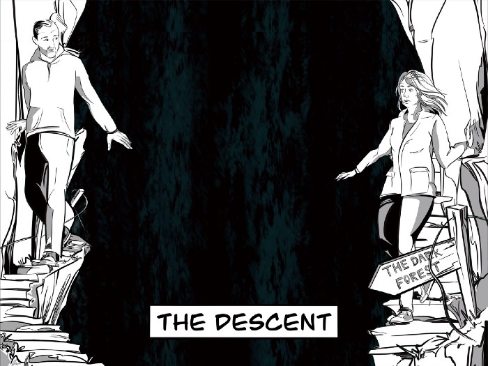 You feel alienated. You realize there is no room for exploration within your tribe, and exploration is what you need; the cracks are showing, and you cannot ignore them any longer. Enough is enough. The mystery calls, and you begin to descend. You know there are others out there, you saw them at the edge, and heard the murmurs of their questioning, which seemed so similar to your own.