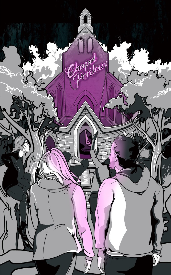 A purple light appears, and you see a neon sign flickering. The sign reads “Chapel Perilous,” and the purple light starts to reveal the contours of a structure, one that does not seem to belong to this time. It seems like it does not belong to time at all.